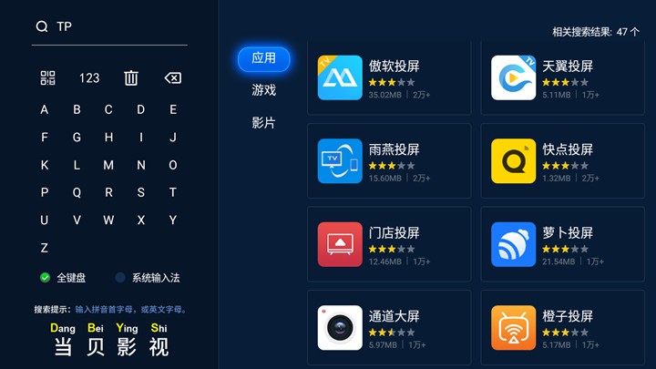 3.将当贝市场之类的第三方应用市场安装到投影仪后,就可以搜索各种投屏工具。根据提示即可成功将手机投屏到投影仪中。