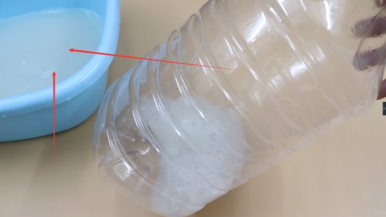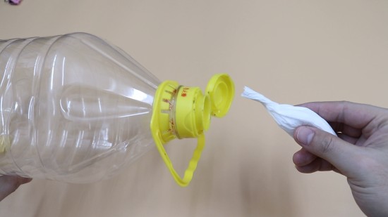 然后用纸巾把食盐和食用碱包裹好,搓成长条再塞到油瓶里,再倒入适量的温水,用温水来清洗,可以清洗的更加干净。