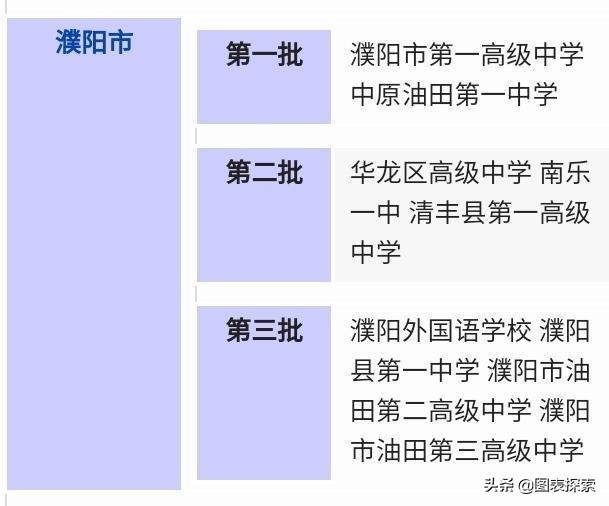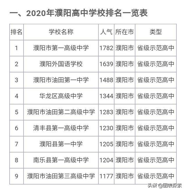 濮阳市户籍人口400万,拥有9所省级示范性高中,其中濮阳市一高和油田一中是2005年第1批省级示范性高中。华龙区高级中学,南乐一中,清丰一高是第2批省级示范性高中。濮阳外国语学校濮阳县一中,濮阳油田二中,濮阳油田三中进入了第3批省级示范性高中!当然,经历了十几年这样的评定方式一定程度上反映了濮阳市高中的排名,但是也出现了一些细微的变化!