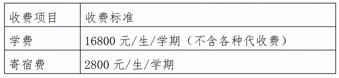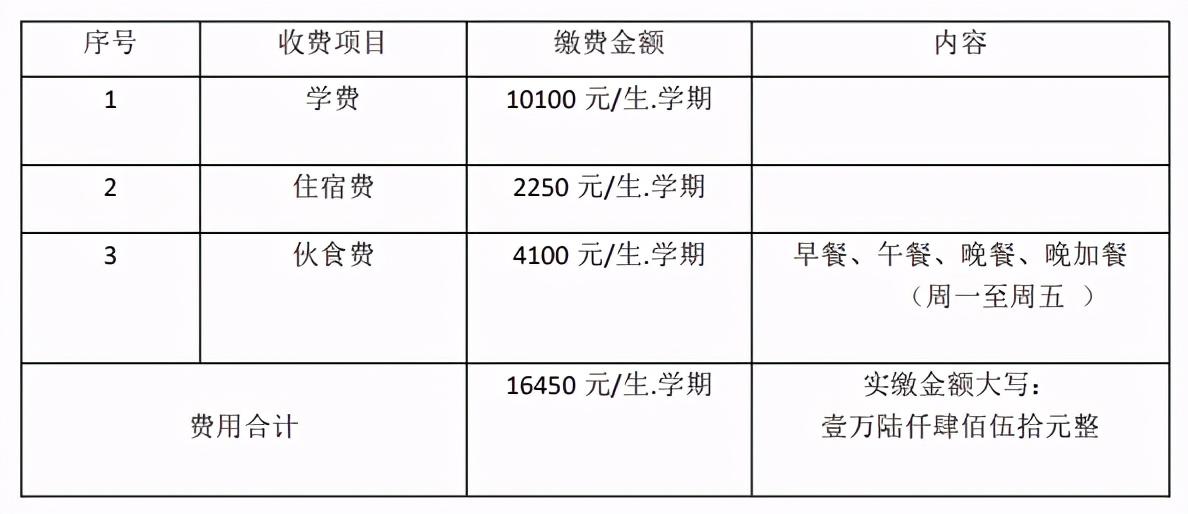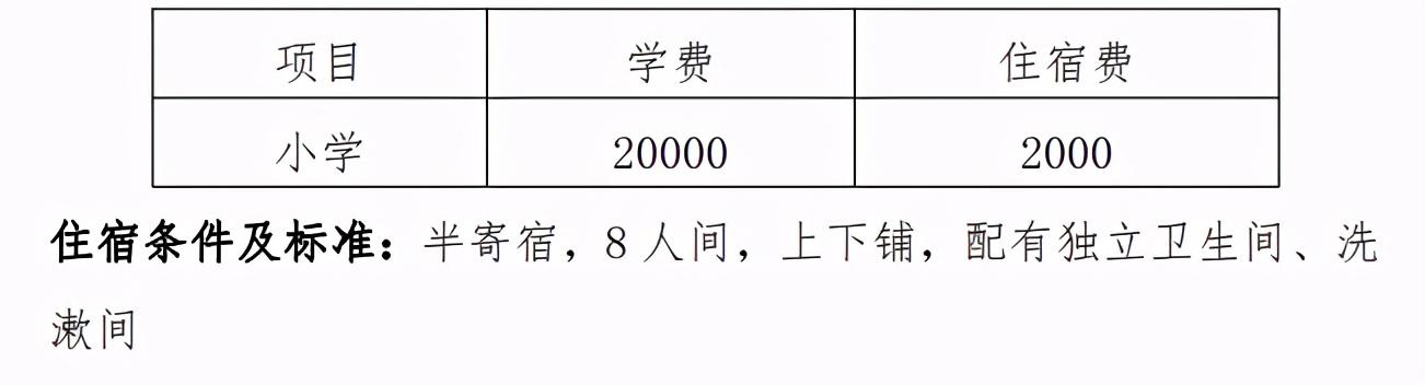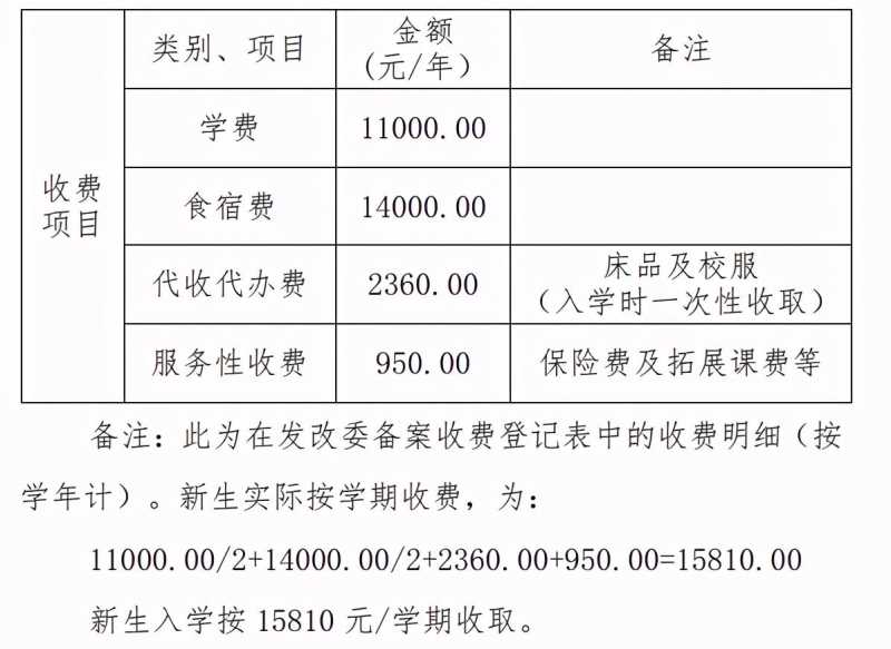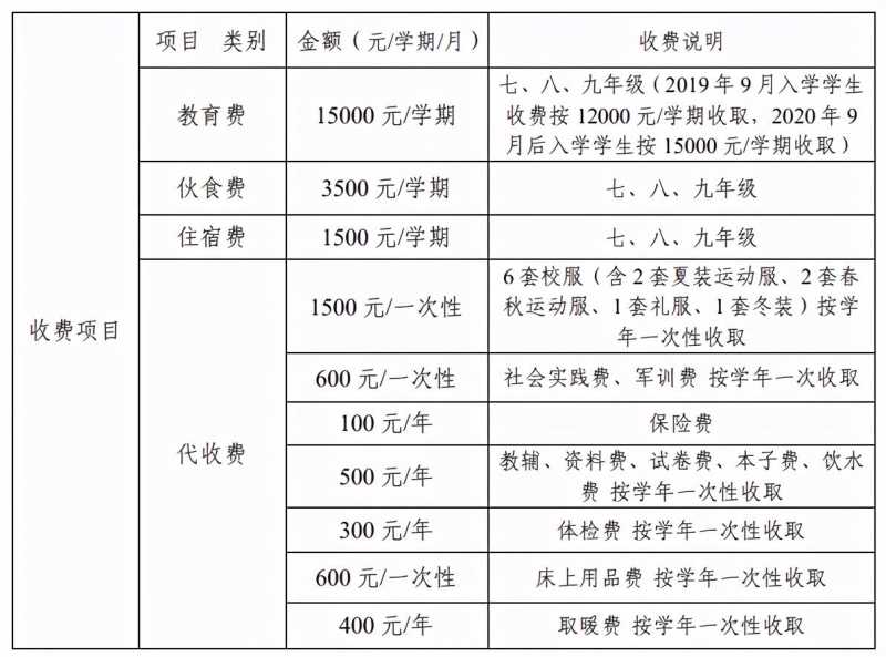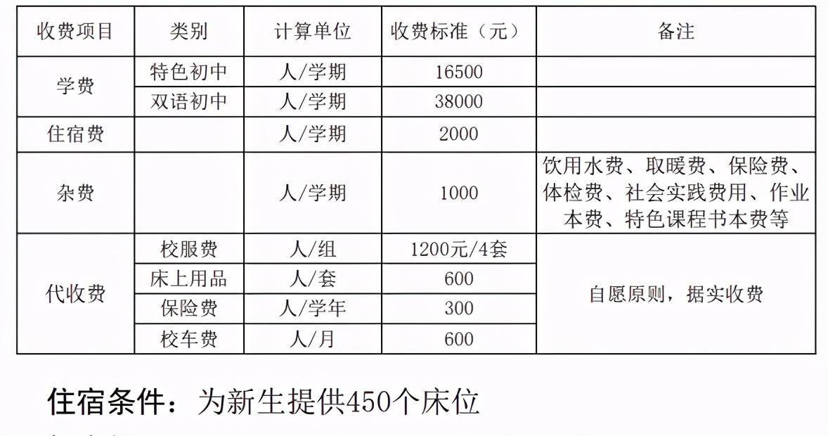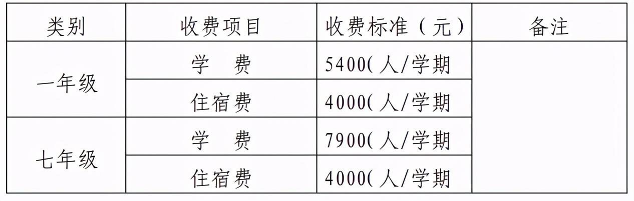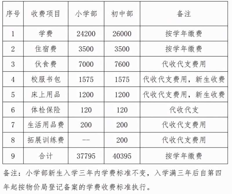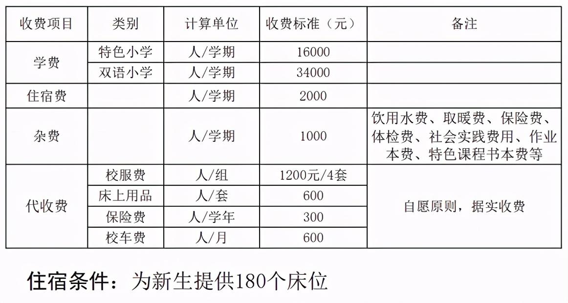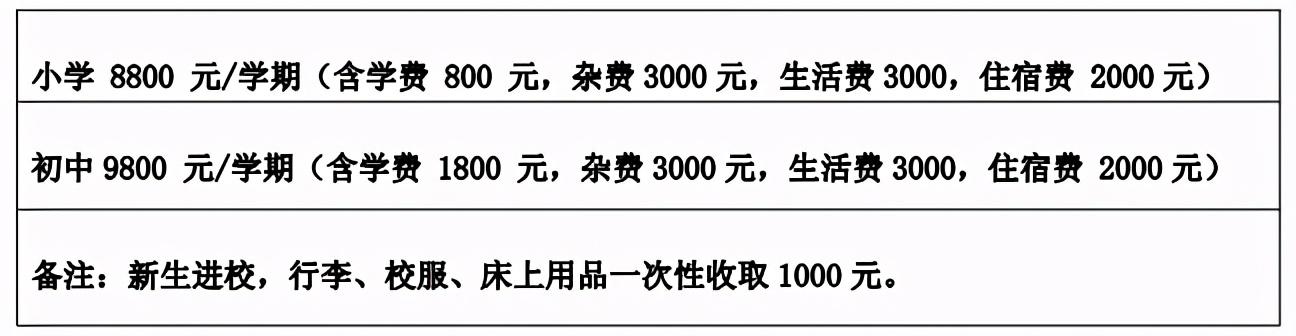 (备注:另收校服费(入学一次性收取,含春夏秋冬全套)、床上用品和书包费用共 2140 元/生。)