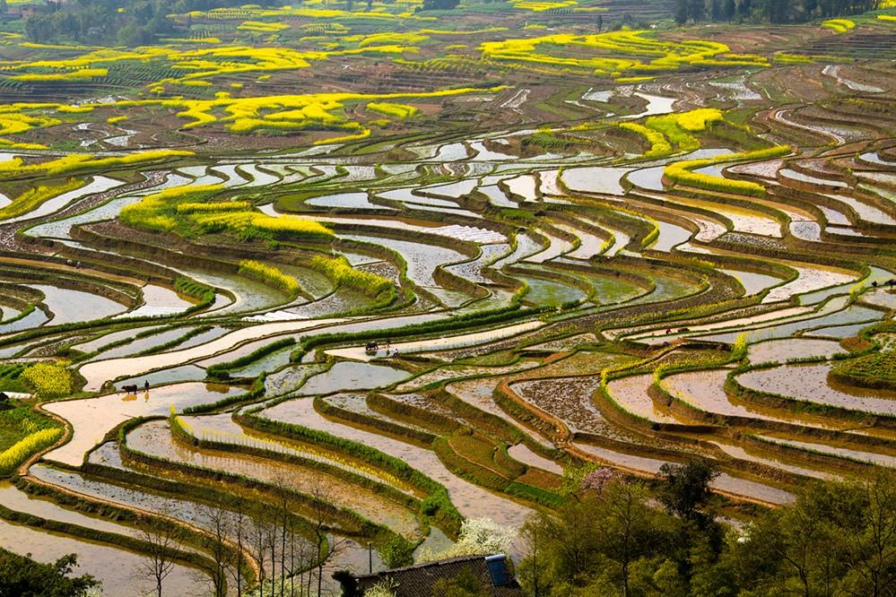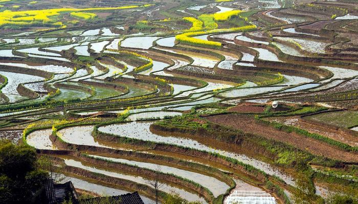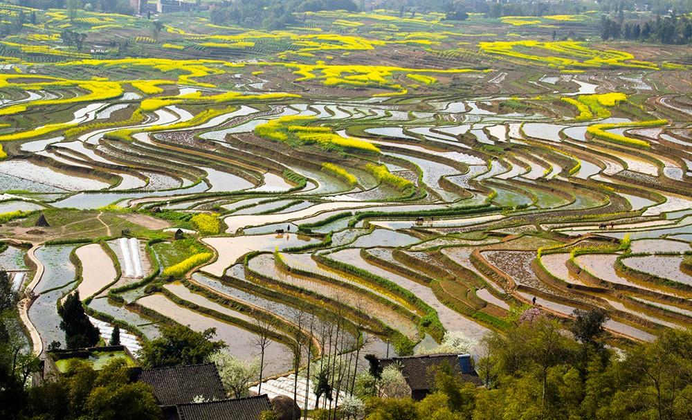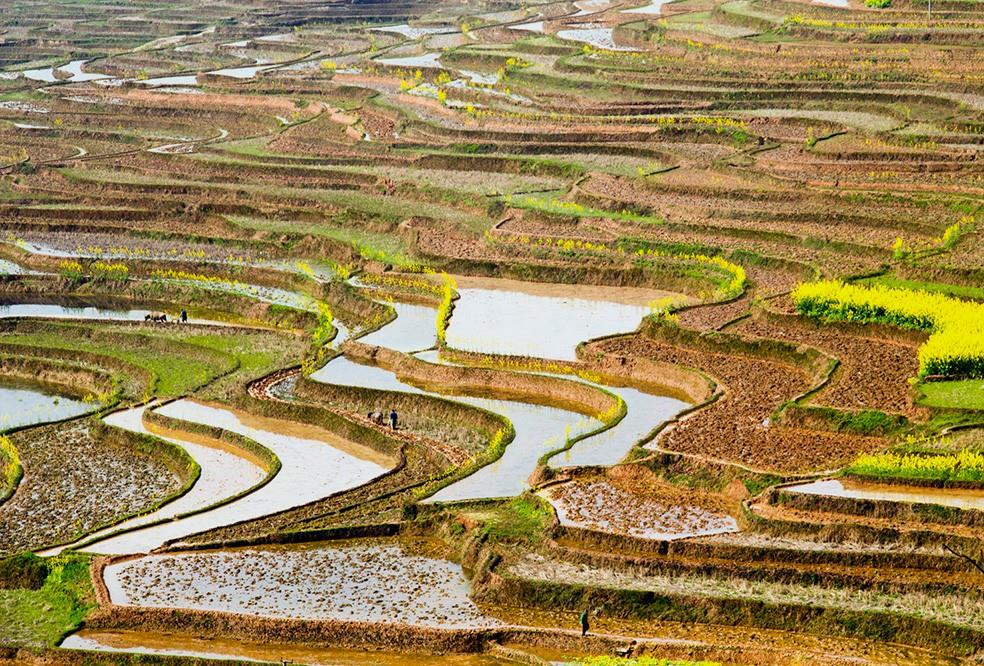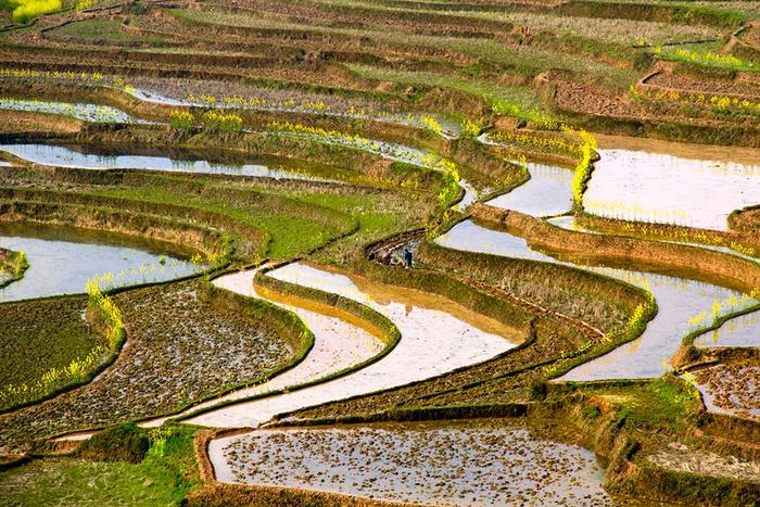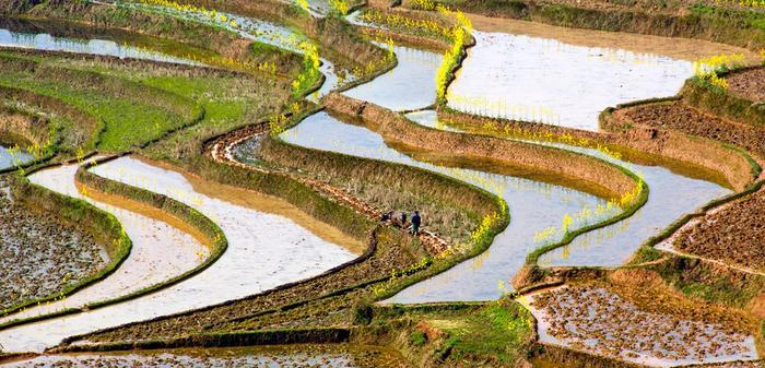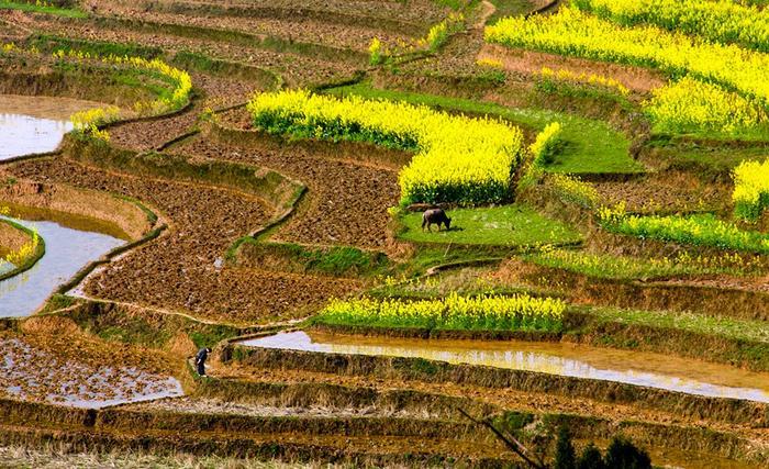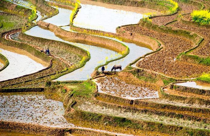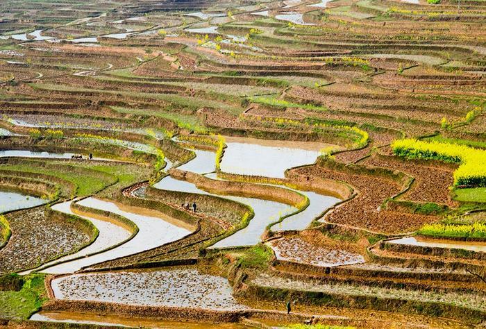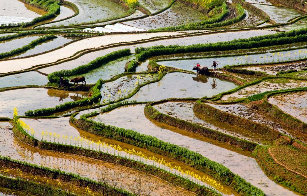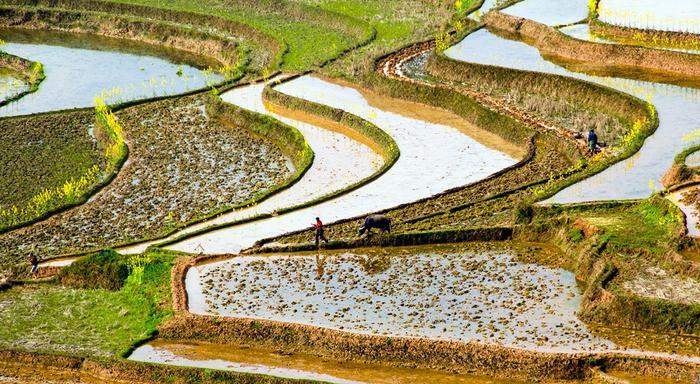 田园风光、诗情画意;缓缓梯田,春暖花开,春耕人勤,水面如镜,田埂吐绿,菜花金黄,春意盎然…… (原创, 图视天下 摄,如需转载须经作者同意)