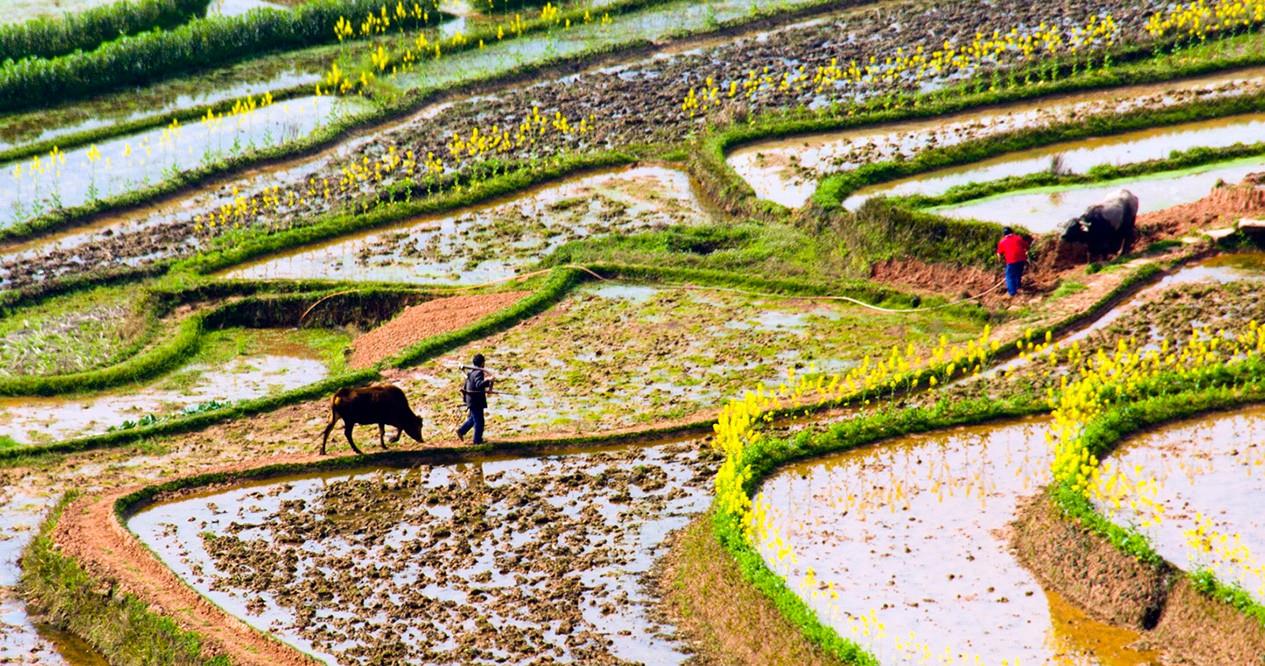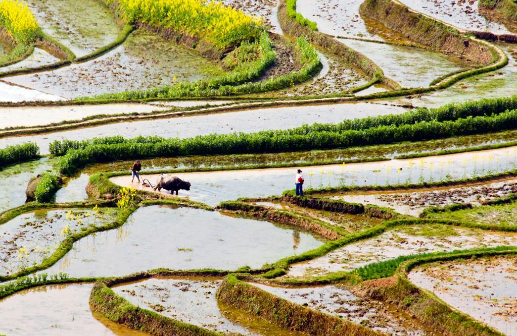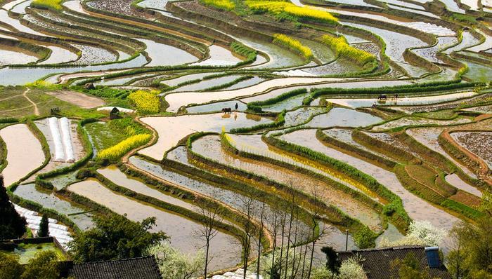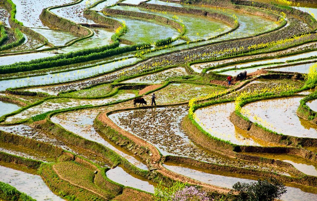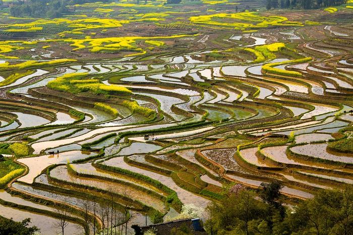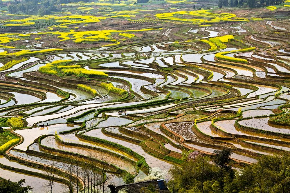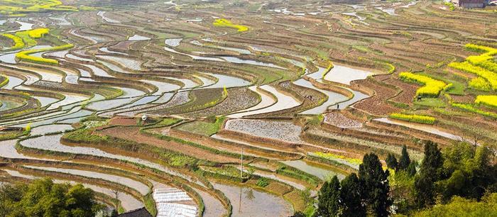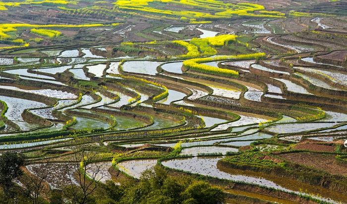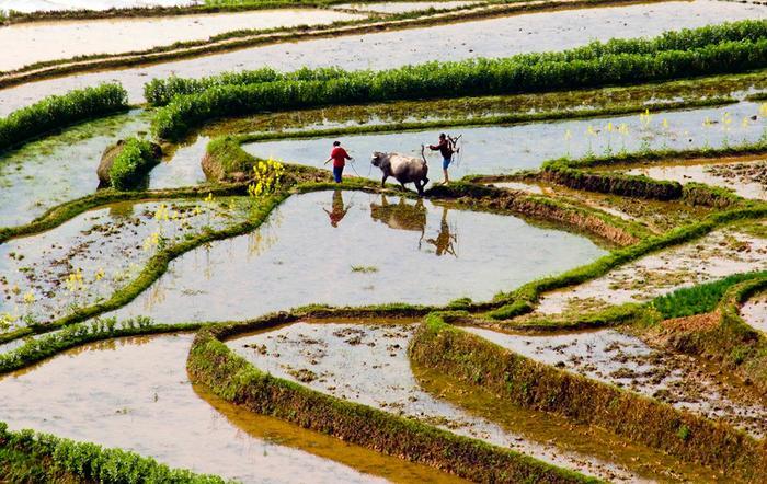 田园风光、诗情画意;缓缓梯田,春暖花开,春耕人勤,水面如镜,田埂吐绿,菜花金黄,春意盎然…… (原创, 图视天下 摄,如需转载须经作者同意)