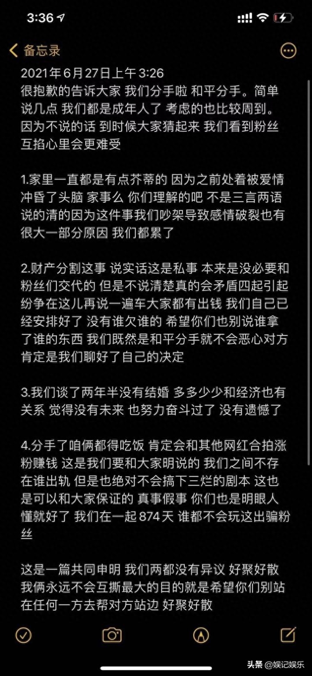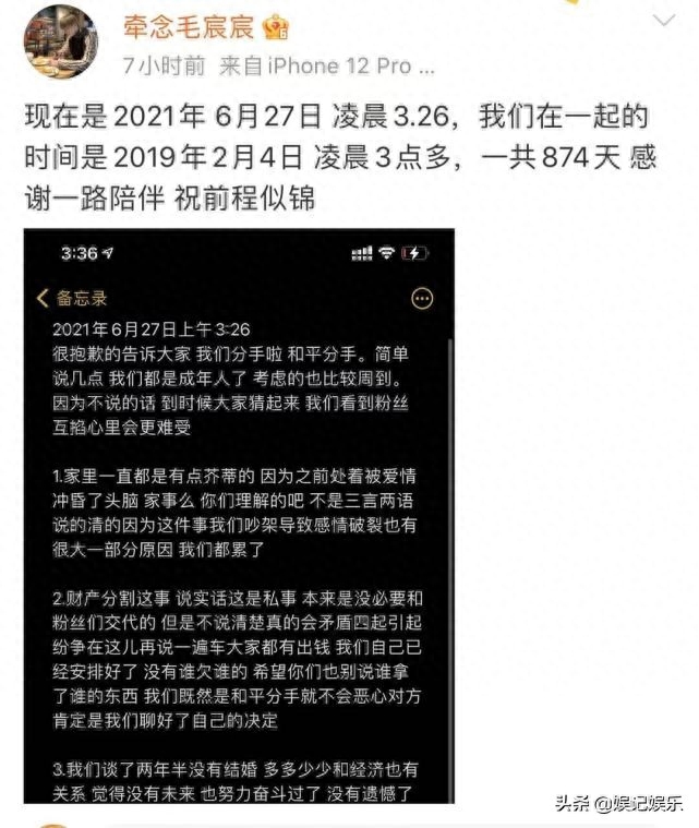 杨清柠毛宸宸也曝光了分手原因,一部分是因为家里的事情,总吵架导致感情破裂,另一部分原因是因为财产分割,两人谈了两年,虽然没有结婚,但是多少也有经济联系,分手也把财产分割安排妥了,两人属于好聚好散。