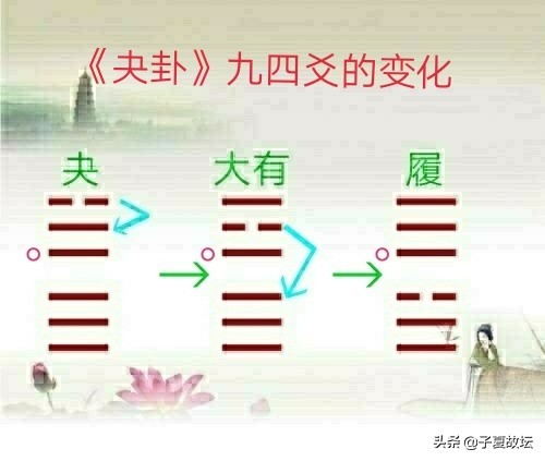《夬卦》是消息卦,根据消息卦的自然变化规律,《夬卦》接下来会变为《乾卦》。若如此,《夬卦》九四就会成为《乾卦》九五,从而实现“飞龙在天”的梦想。然而,人类社会的发展有其自身的变化规律,往往受人的主观能动性的影响,《夬卦》实际上会先变为《大有卦》,然後再变为《履卦》。《夬卦》最终会变为《履卦》,最终成为九五君王的不是《夬卦》九四,而是《夬卦》九三。在一系列卦变过程中,《夬卦》九四根本就没有改动位置,故曰“其行次且”。