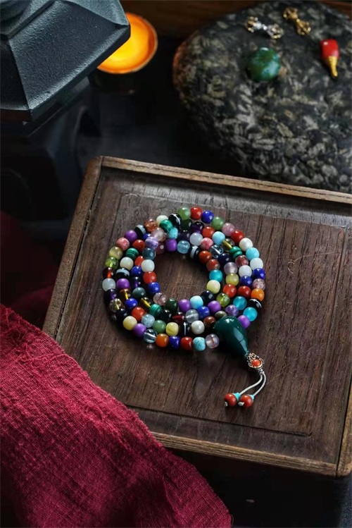 这种美丽又寓意丰富的首饰,是由藏式手串演化而来的。用名贵的珠子进行搭配,初期制作多宝多采用蜜蜡。天珠之类的色彩质朴的宝石材质,后期根据人们的审美加入了一些新鲜的元素,绿松、琉璃、砗磲、水晶之类的色彩明快的材质也加入进去。