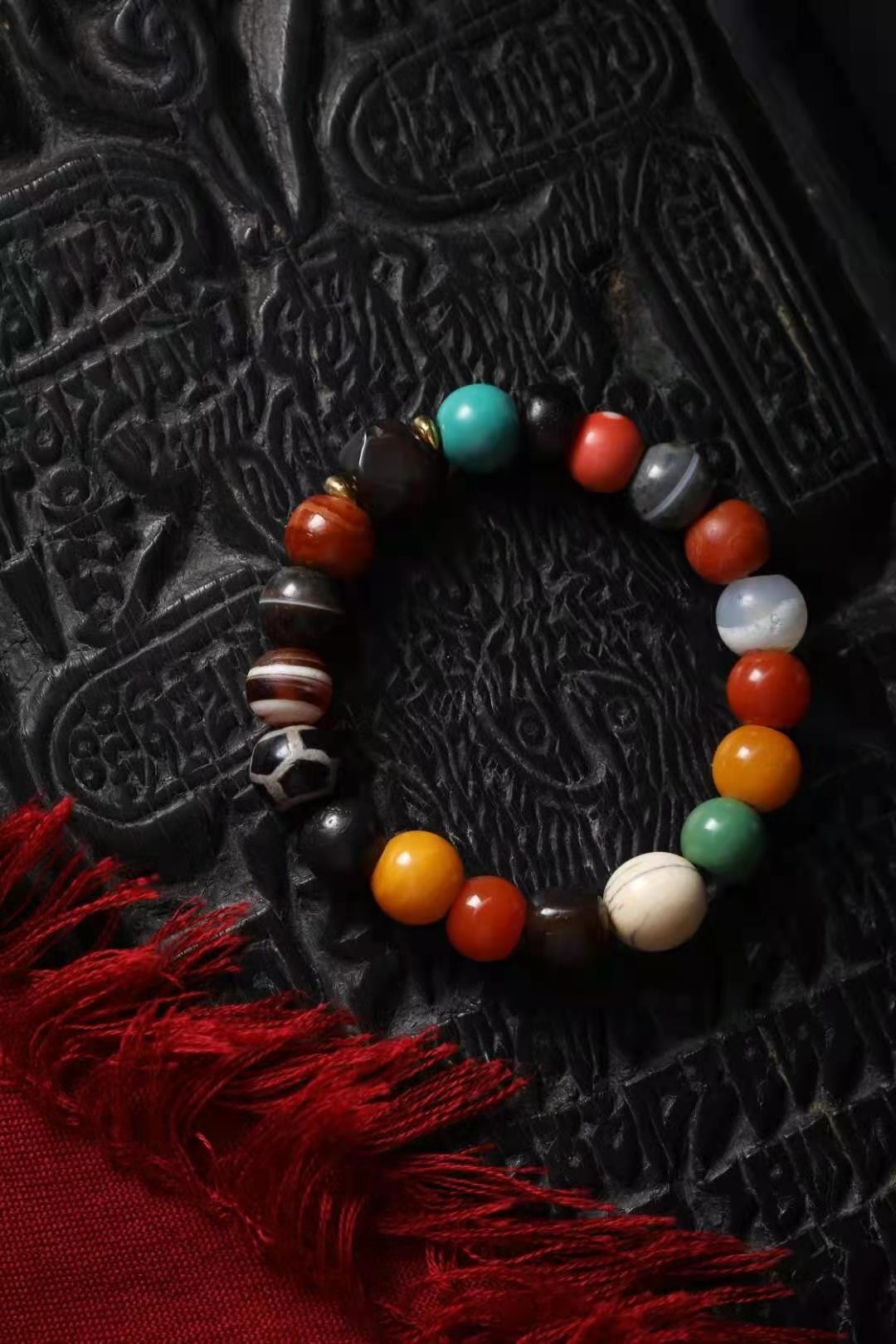 多宝手串既然是传统藏饰演化而来的,需要颜色丰富,形成强烈的色彩冲击(俗称撞色)才好看。而且,可以根据自己所属五行选择穿多宝的材质。