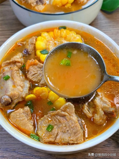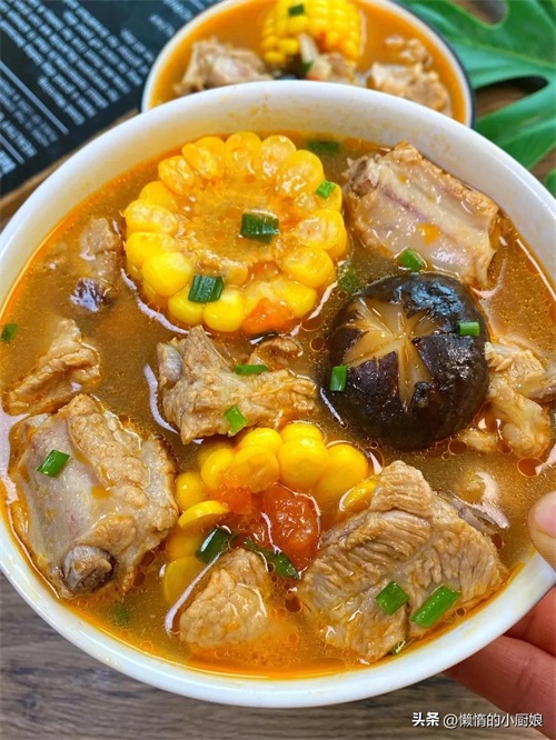 2、锅中油热番茄块翻炒至软出汁,排骨翻炒均匀,放玉米、香菇加适量水,盖上锅盖炖30分钟左右