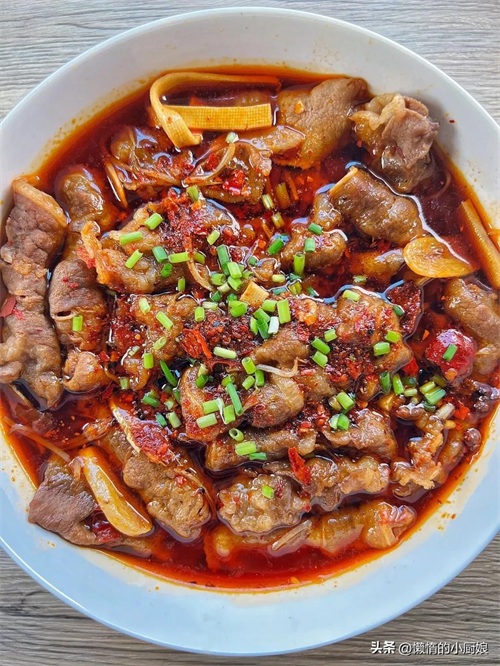 2️、加入一碗清水煮开,放入适量鸡精和白糖,一勺生抽,把蔬菜倒入锅里煮熟捞出放碗里打底,下肥牛卷煮熟捞出放在蔬菜上面,最后放一勺辣椒粉在肥牛卷上,淋上热油放一点葱花即可❗