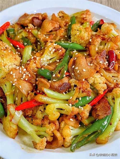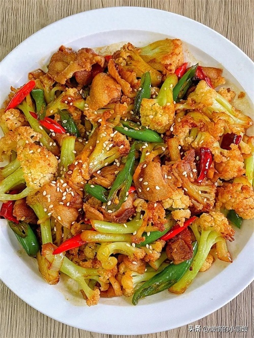 3、倒入线椒小米辣炒出香味,加入花菜翻炒一下,加一勺生抽+半勺老抽+少许盐+一小勺糖+一小勺鸡精翻炒均匀即可。