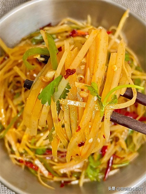 3️、料汁倒入土豆丝里,加些香菜抓拌均匀。