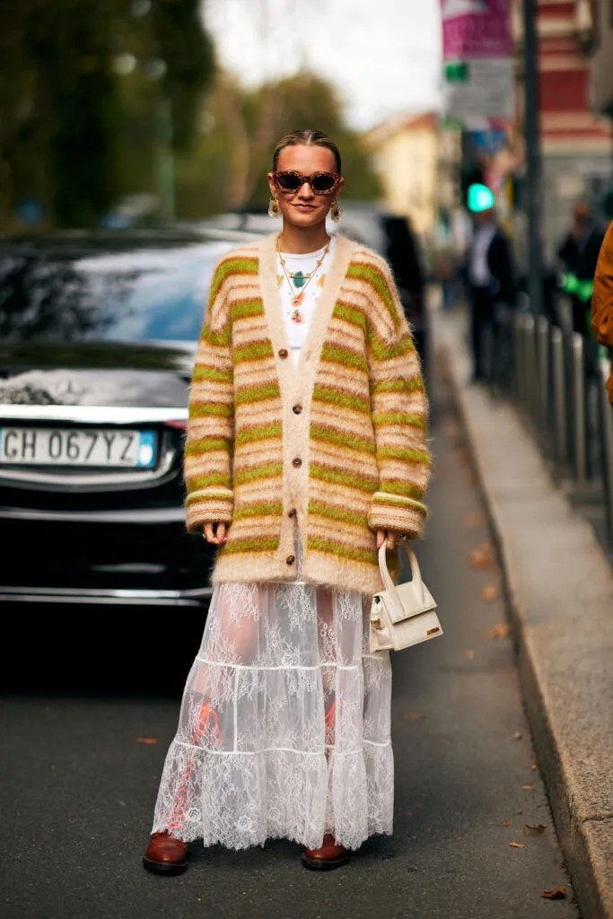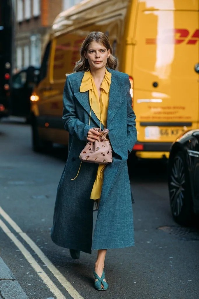 黄色复古衬衫,配简洁的复古绿大衣,倒在复古的色调与设计间,拿捏到位。为领口劈开一方时尚,为风格描画一份复古。