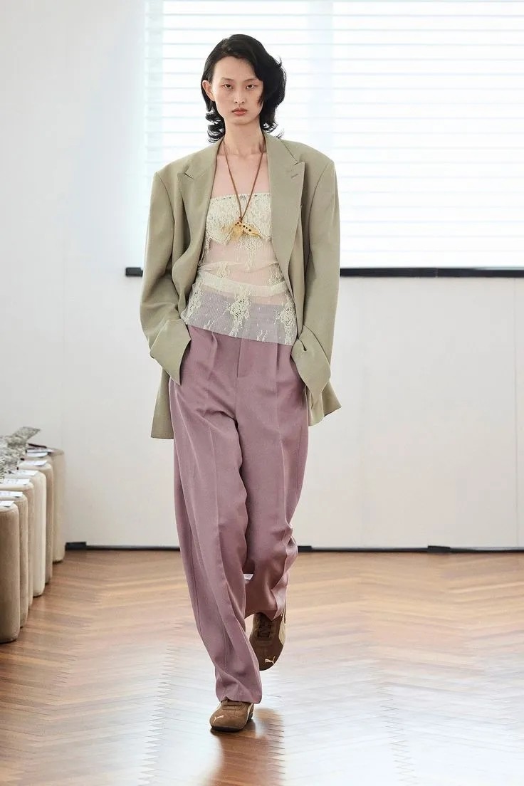 同样衬衫套装,廓形一换,唱起了睡衣风的力量主调。中性、流行、酷感混搭,在型、质、色中体现到位。