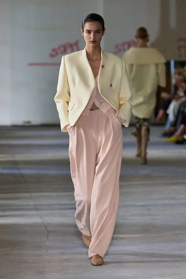 用雅黄西装+樱花粉阔腿裤,来开启春天吧。一身高雅里,清新脱俗,设计、色调,此刻双向奔赴,描画春之恋曲。