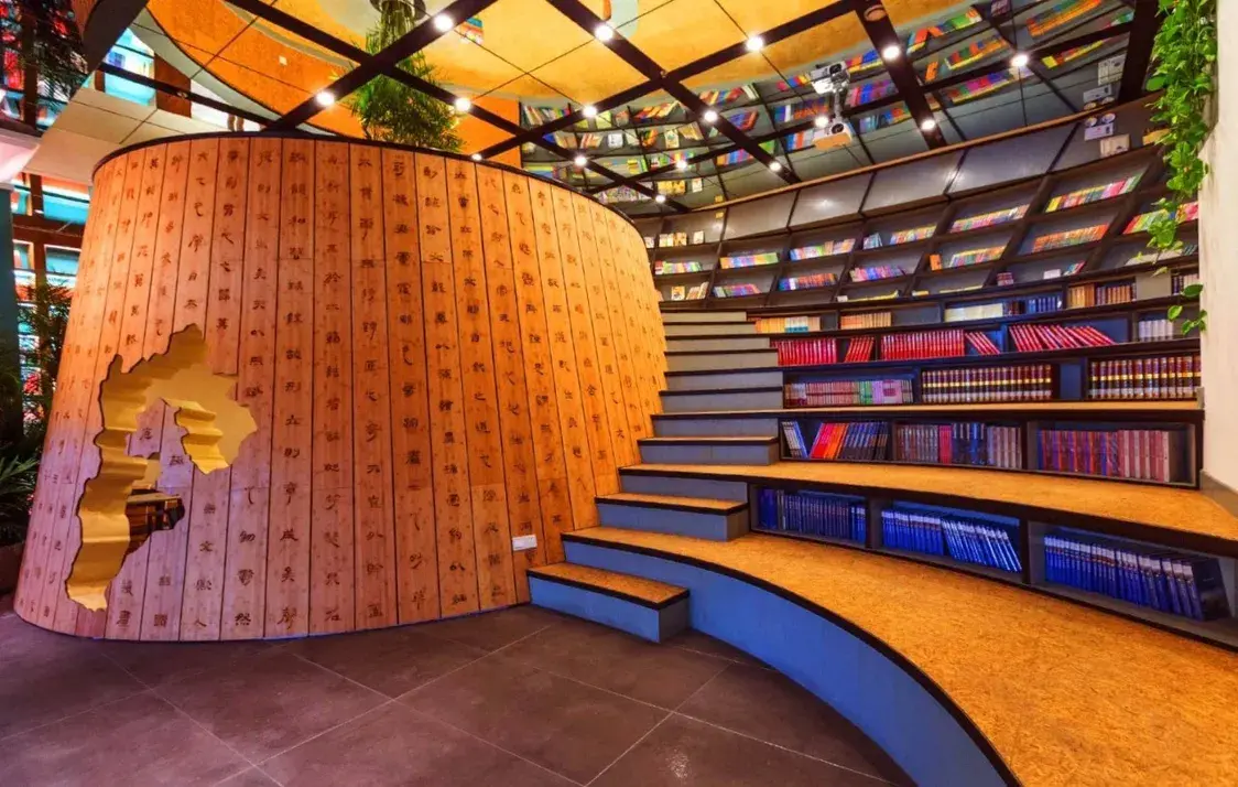 书店中有一处极具特色的竹简造型,上面雕刻着由河北省知名书法家杜锡瑞题写的《文心雕龙原道》的文字,镂空部分则是河北地图的剪影。充分体现了河北元素,既传递着独特的文化韵味,寓示着古代文明与现代文明的对话和交流,又具有分隔空间的实用价值。