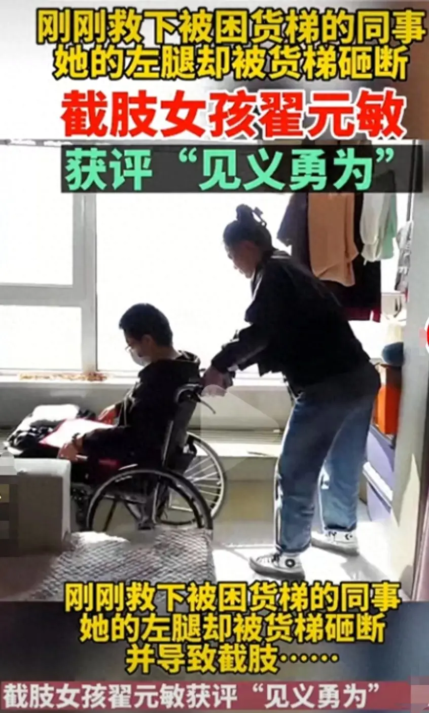 那天,翟元敏和她的同事们在仓库工作时,突然听到货梯发出异样的声音。她意识到可能有同事被困在货梯里,于是毫不犹豫地冲过去救人。就在她成功救出被困同事的时候,货梯突然倒塌,她的左腿不幸被砸断。