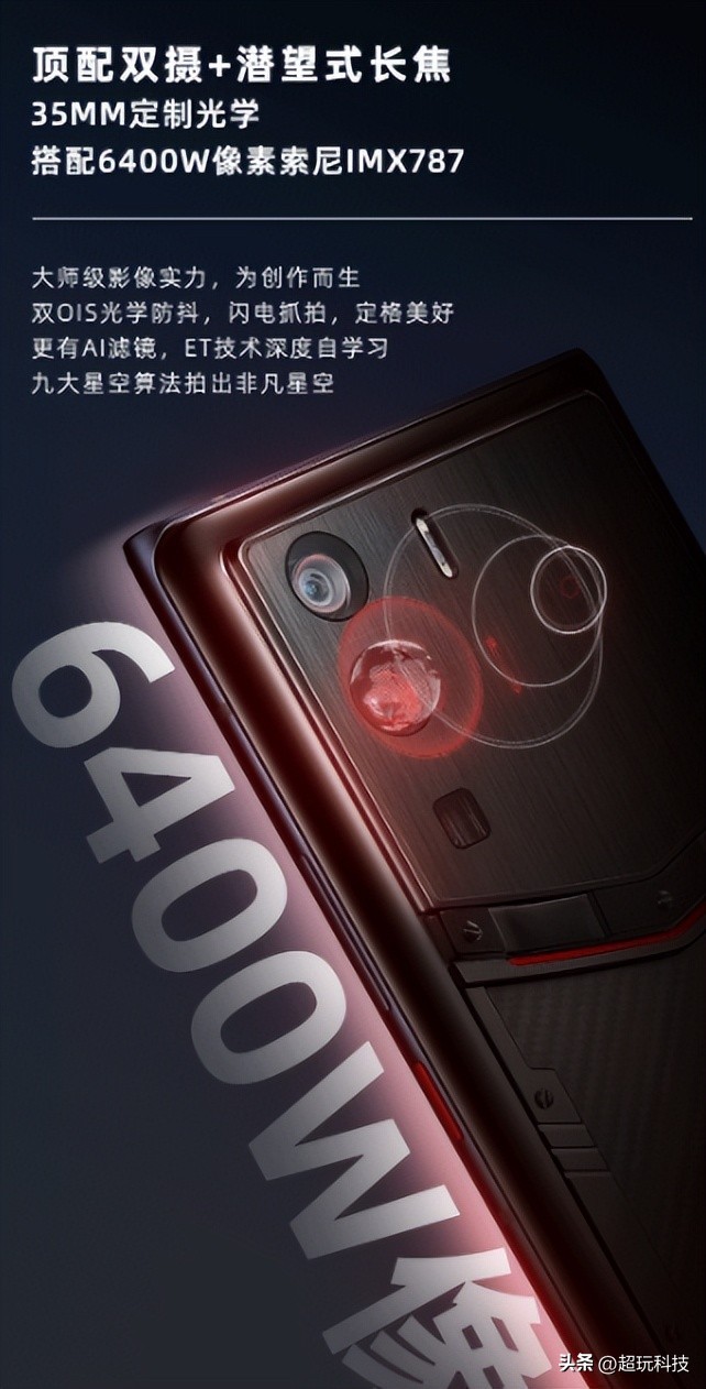 拍照方面:该机同样亮点十足,6400万像素采用了超人文主镜头+5000万像素超广角镜头+800万像素潜望长焦镜头的3摄组合,这是采用IMX787 35mm人文主摄像头支持9倍光学长焦。前置则是1600 万像素摄像头
