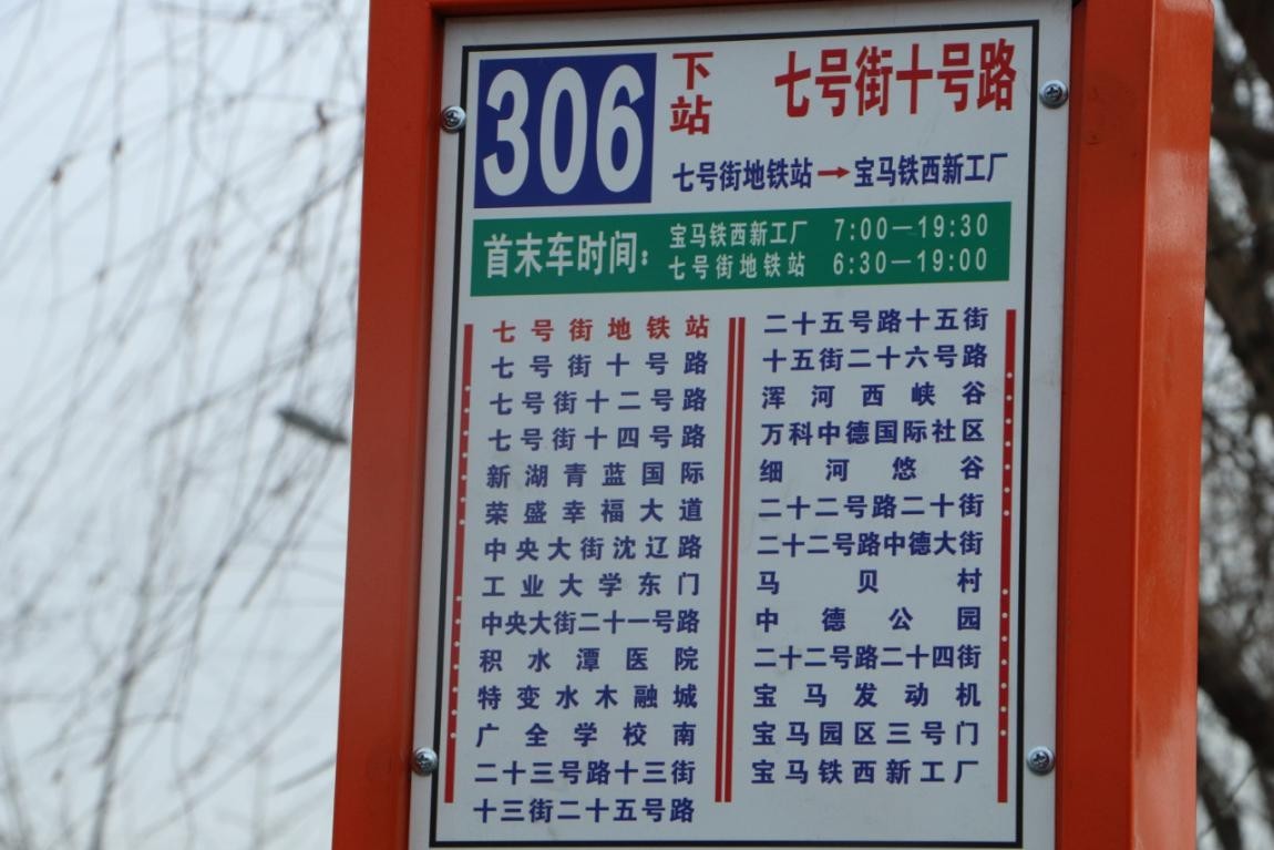 306路公交由七号街地铁站至宝马铁西新工厂,共设27站,经过荣盛幸福大道、工业大学东门、积水潭医院、浑河西峡谷、中德公园等站点。七号街地铁站首末车时间为6:30和19:00;宝马铁西新工厂首末车时间为7:00和19:30。