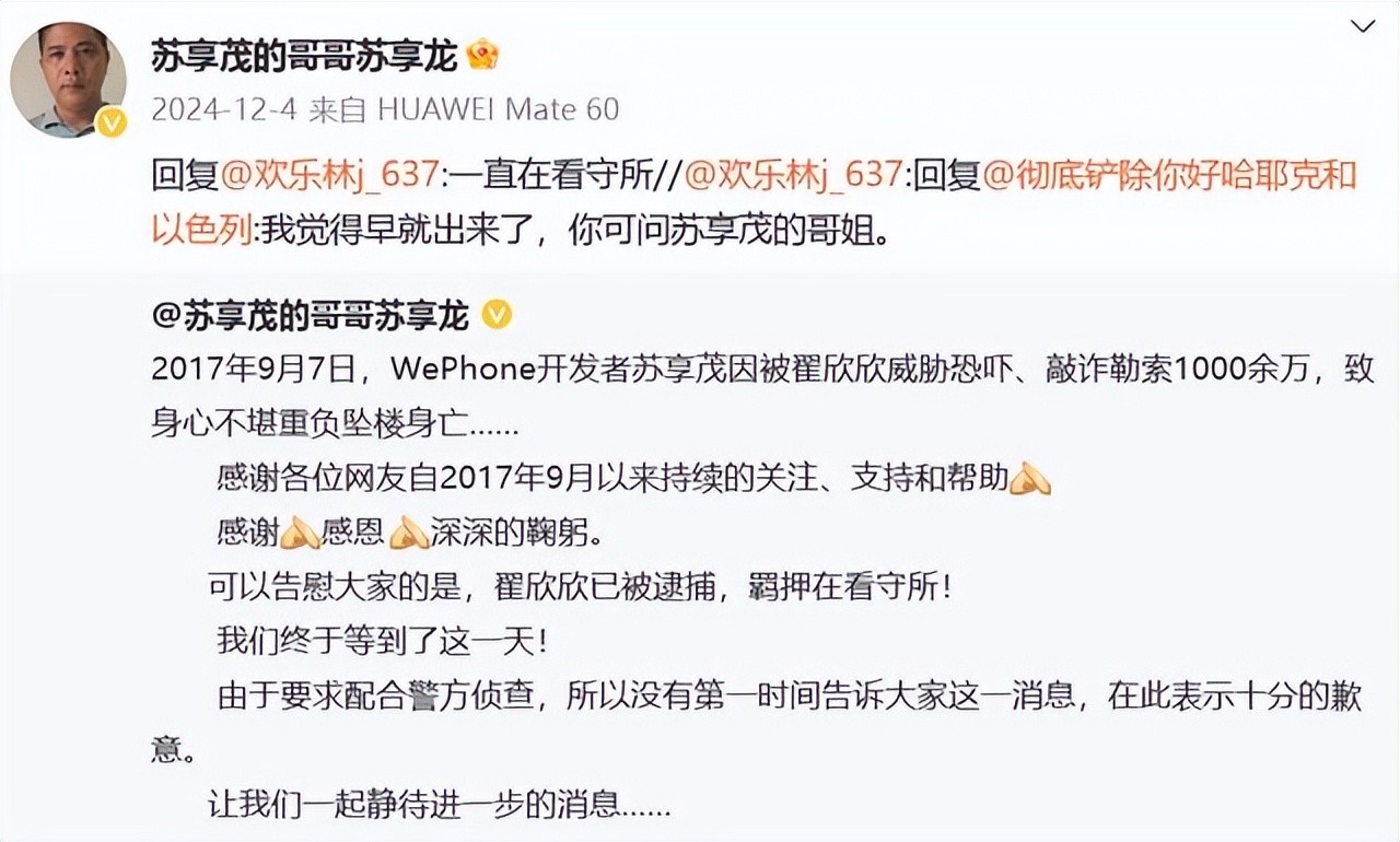 2023年6月9日,苏享茂的哥哥苏享龙发文称翟欣欣已经被逮捕,羁押在看守所。2024年12月4日,苏享茂的哥哥苏享龙回应网友“翟欣欣早就出来了”的猜测,称她一直在看守所。