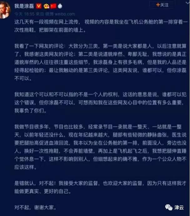 2019年8月7日,涂磊公开在微博发了一封道歉信。信中涂磊表示因为自己常年主持,所以他的腿部有轻微的静脉曲张。医生告诉涂磊,一定要把腿抬高促进血液回流,所以自己才会做出这种行为。而且涂磊也表示自己是看见前面没有人,而且还换了一次性的拖鞋,所以才会去蹬机舱。