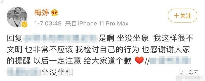今天凌晨,面对有网友留言说她“坐没坐相”,梅婷转发并道歉。