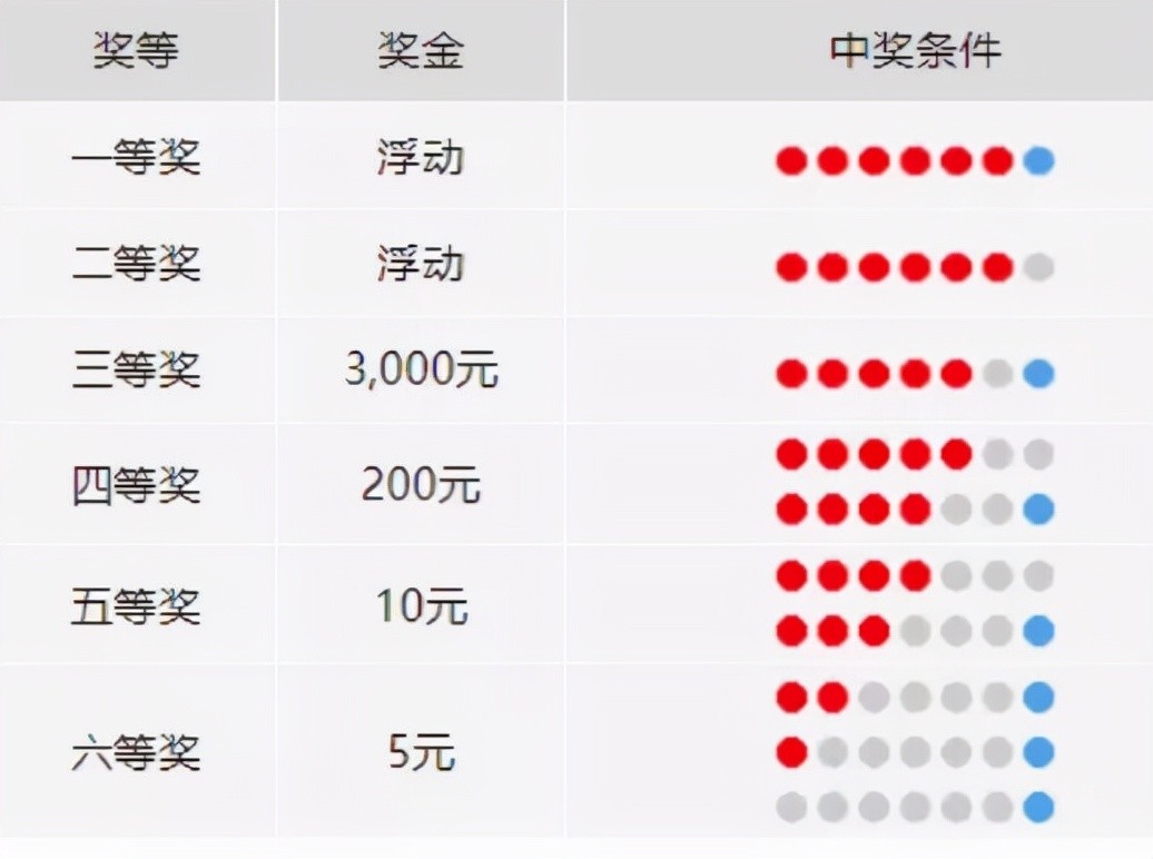 五等奖:投注号码与当期开奖号码中的任意4个红色球号码相同,或与任意3个红色球号码和1个蓝色球号码相同,即中4个红球或中3个红球1个蓝球(中4+0或3+1)。单注奖金固定为10元;
