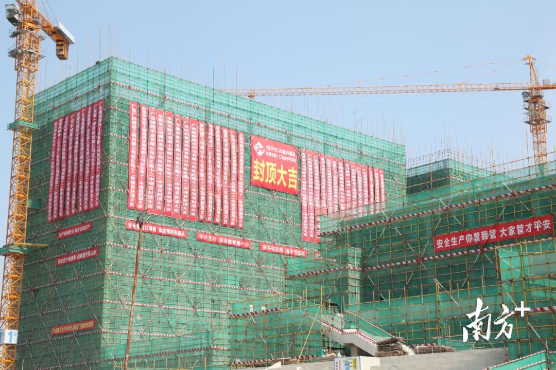 近日,随着最后一方混凝土浇筑完成,东莞市第十二高级中学(下称“十二中”)主体结构顺利封顶。此举也标志着该校项目工程进度转入室内装修和外墙装饰、运动场建设环节,距离本年底土建竣工、2025年春季验收交付投入筹备办学,更近了一步。