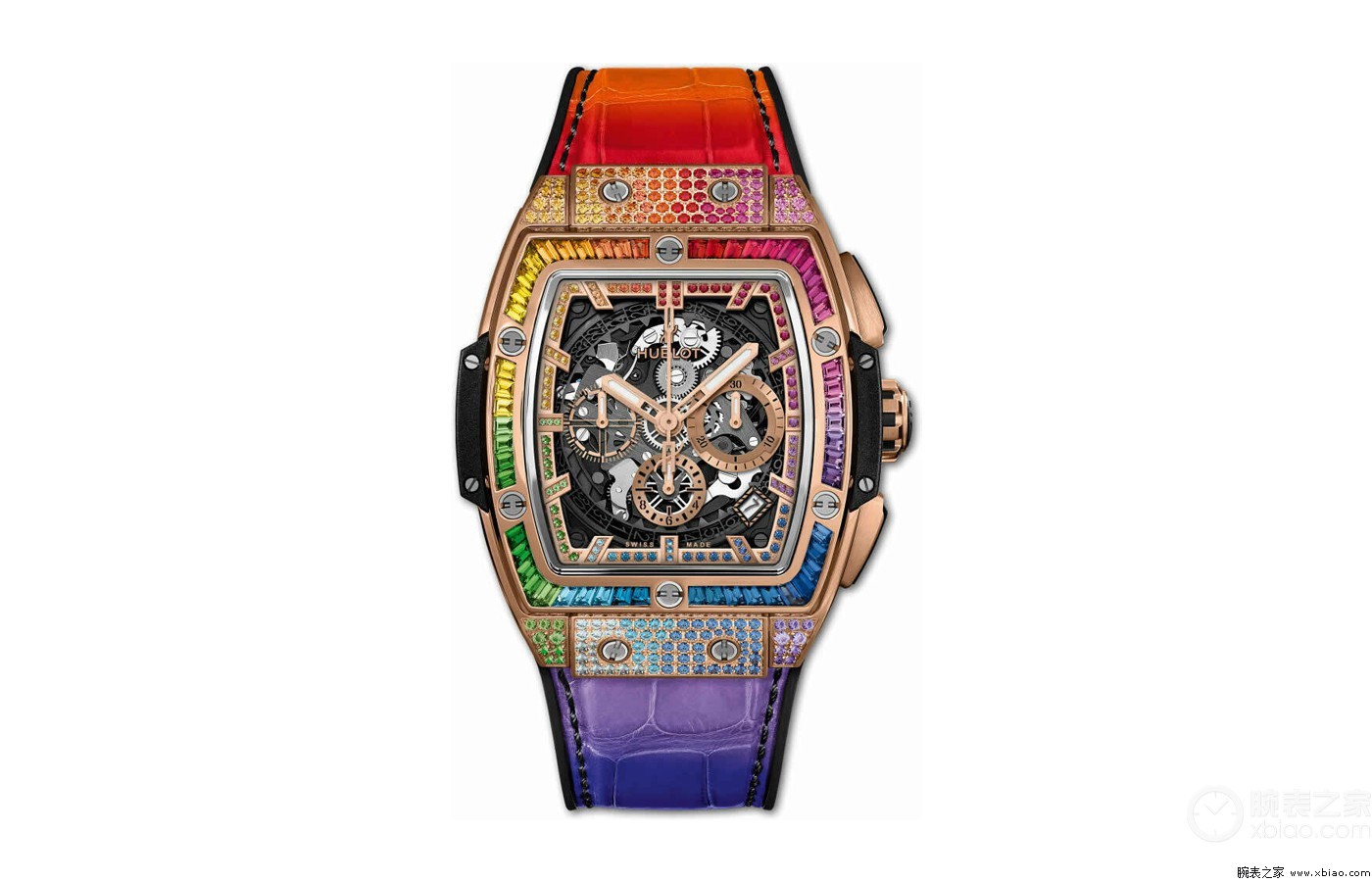 这款Big Bang灵魂彩虹腕表沿袭了宇舶表的炫酷风格,腕表上共镶嵌了309颗圆形和长方形切割彩色宝石,将红宝石、粉色蓝宝石、紫水晶、蓝色蓝宝石、蓝色托帕石、沙弗莱石、黄色蓝宝石以及橙色蓝宝石这八种流行色调集于一体,呈现出彩虹的绚烂色彩,再加上七彩颜色的鳄鱼皮表带,真的像是把彩虹戴在了手腕上。