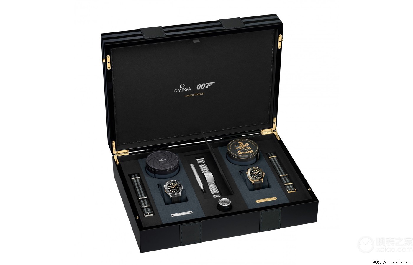 这款欧米茄海马系列300米潜水表詹姆斯·邦德限量版套装的表盒采用007专属的Globe-Trotter™手提箱设计,非常炫酷。套装内一共包含两枚腕表,另附一条精钢表链和两条NATO表带,限量发行257套。