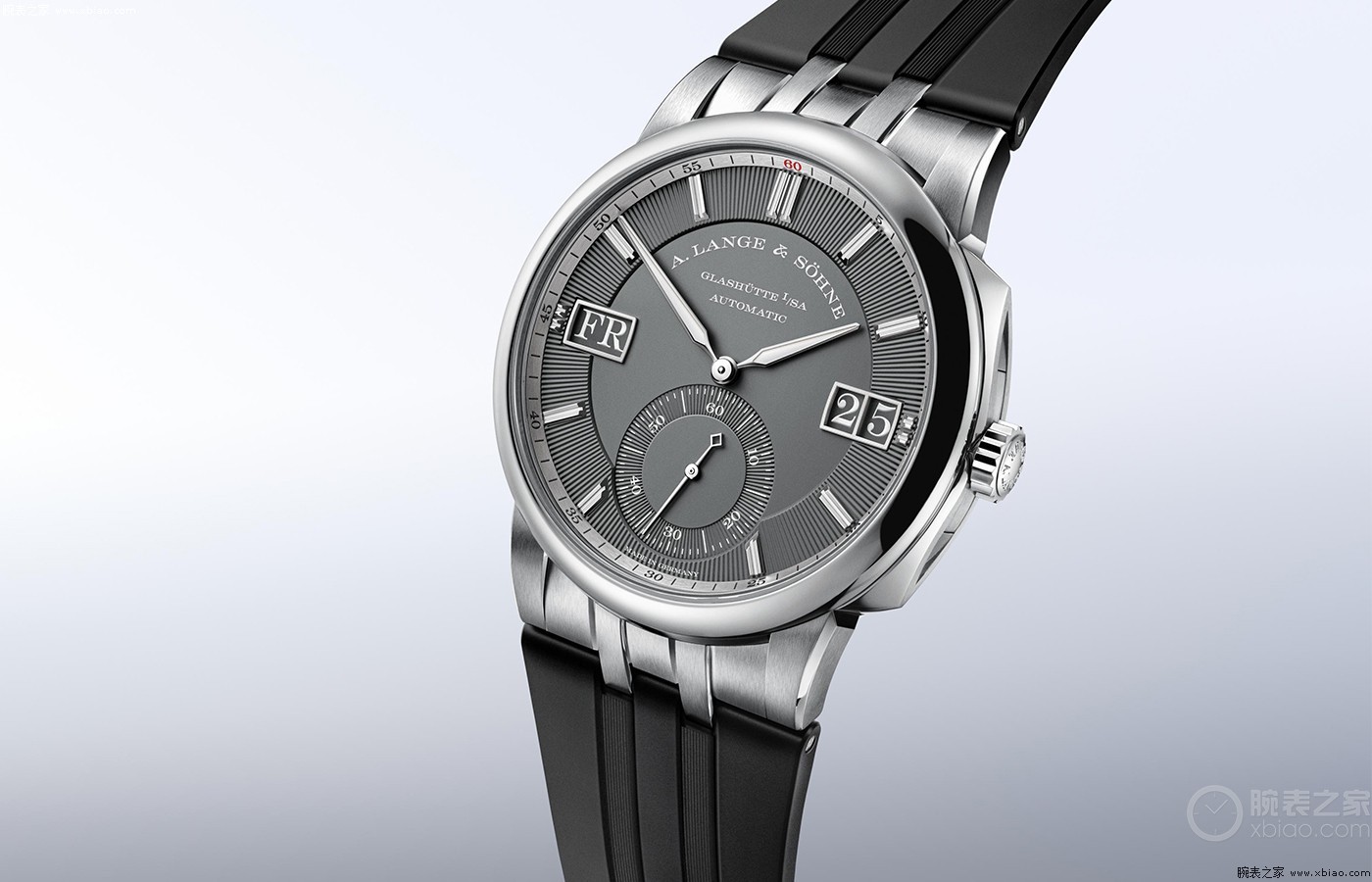腕表采用防水表壳,搭配灰色表盘,凹槽小时刻度和小秒盘刻度下方的雕刻纹饰设计更加突显表盘的立体效果,并与主表盘和副表盘内圈的哑光平滑表面形成对比。此外,朗格的标志性大日历显示设于经典双视窗内,而一样大小的星期显示则设于表盘的另一端,两者精妙结合,呈现瞩目的视觉效果。