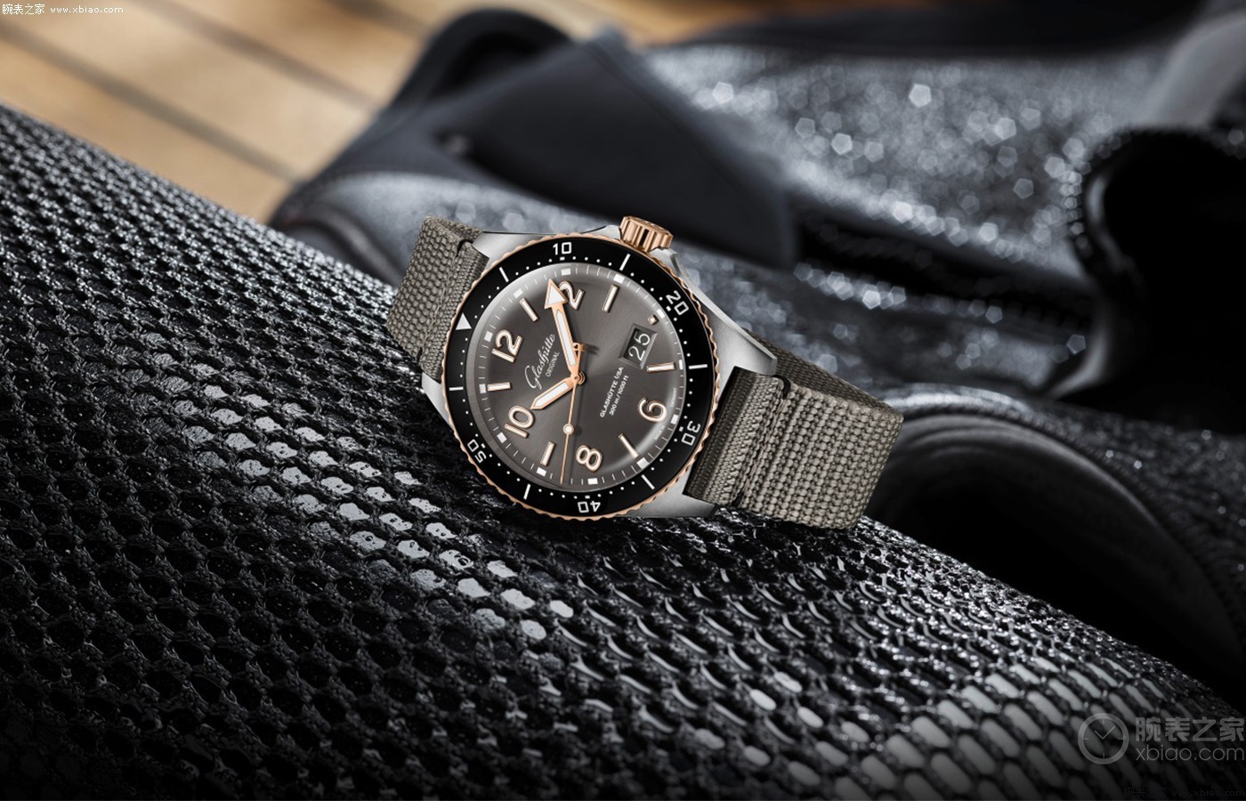 去年,格拉苏蒂原创推出SeaQ潜水表,而这款今天我们看到的则是SeaQ线今年刚刚新添的表款。这枚双色表款的电镀灰色表盘饰有太阳纹,其银灰色调与精钢表壳的色泽和谐匹配。旋转表圈和表冠的红色18K金材质散发出的温暖光泽,与冷灰色调形成对比互补。
