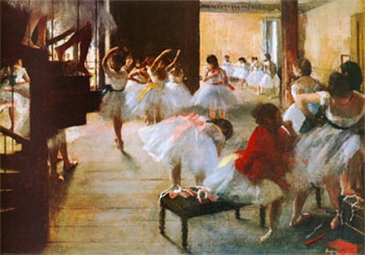藏品的历史背景和来源:《舞蹈教室》是法国印象派画家埃德加·德加于1874年创作的一幅世界名画,现收藏于纽约大都会艺术博物馆。作为德加芭蕾舞女系列中的代表作之一,它也是1876年印象派画展的参展作品之一。画作描绘了巴黎舞蹈教室中芭蕾舞考核的场面。尽管德加从未亲眼目睹过这样的考场,但他根据传说创作了这个紧张而繁忙的场景,其中二十多个少女的动作都来自于德加平时对无数舞女的写生。画中出现的演员、教师和穿着黑衣的几位妇女增加了画面的人物丰富度,德加特意将排练厅的大镜子放置于画面中央,以增强空间感。