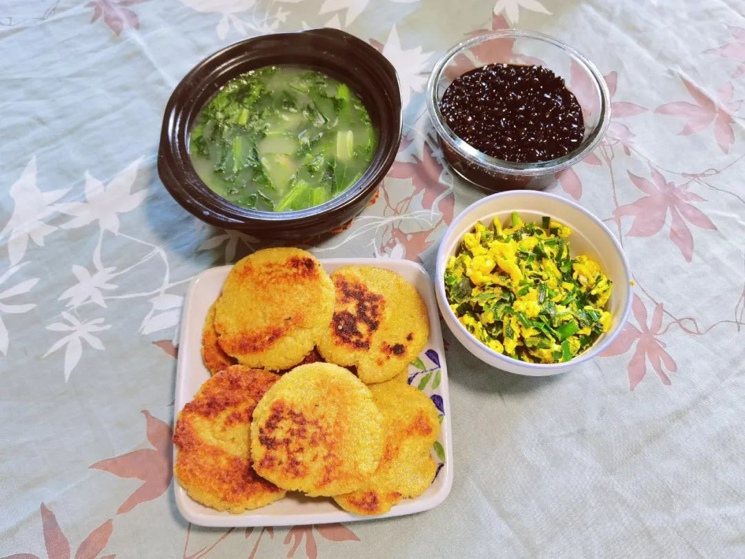 这是一顿早午饭:小米饼(食谱是「辅食记」这款小米饼,香脆酥软,孩子吃了就停不下来),日式蜜汁黑豆,韭菜炒鸡蛋,鸡汤烫小白菜。