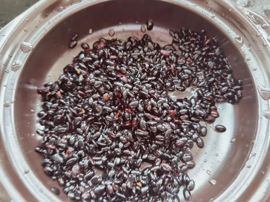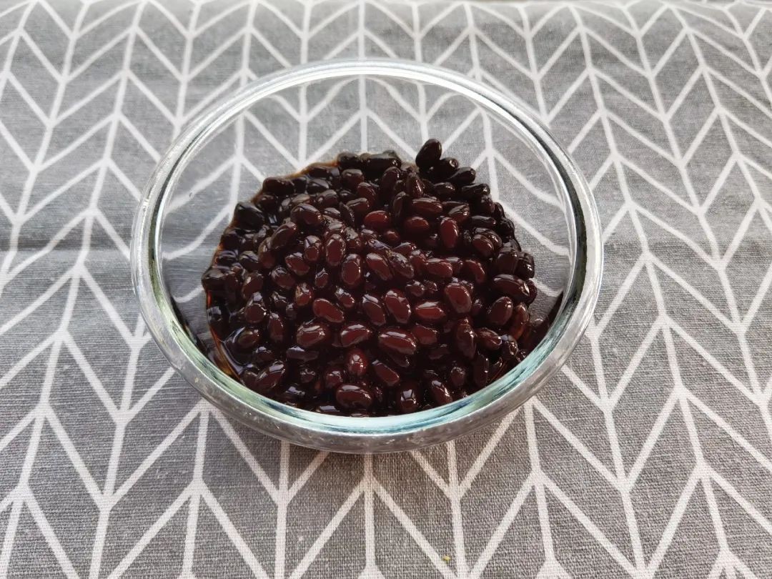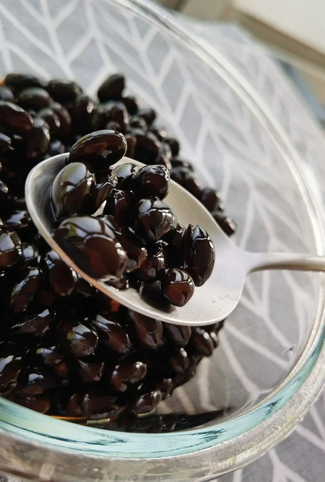 第二天从冰箱里拿出来,找一个小碗(玻璃小碗最好看)装起来,你会发现黑豆不再是纯黑的了,而是隐约发着棕色的光芒。