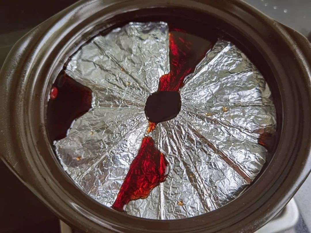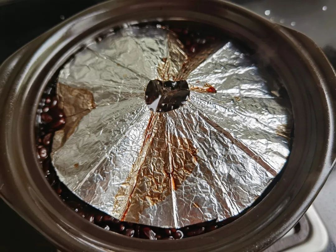 半小时以后,砂锅已经不那么热了,打开锅盖,自己用锡箔纸剪一个“落盖”,落盖是中间有个洞的盖子,它跟砂锅口径差不多,能盖在豆子上,落盖的作用是防止豆皮煮破。