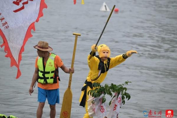 为了“争奇斗艳”,有的龙舟还别出心裁地搭配上西游记、济公、中国航天等各式各样亮丽的“盛装”,引得江畔群众驻足观望,一片欢呼。