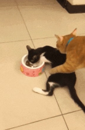 奶牛猫也是巨能吃的猫咪,甚至还会跟橘猫抢食