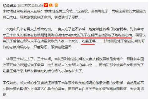 他爆料30年前自己妈妈在上海开饭馆时,著名歌手杭天琪趁他爸爸不在家,趁机吃霸王餐,一群人吃饭不买单,欺负黄毅清妈妈。
