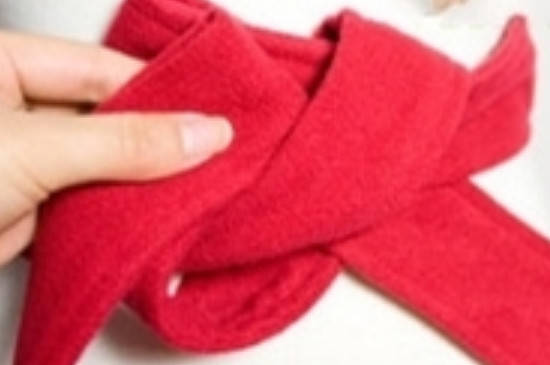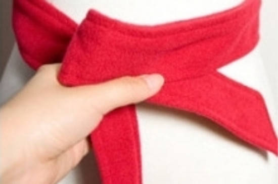 裤带围在腰间并对折成相同长度后,再把左侧裤带向内对折并置于下方。之后将右边裤带对折并绕过左侧对折的裤带,同时将其放在对折裤带的下方,在绕过右侧裤带向外对折固定好,最后将对折的右侧裤带穿过最前面的竖结并略微整理即可。