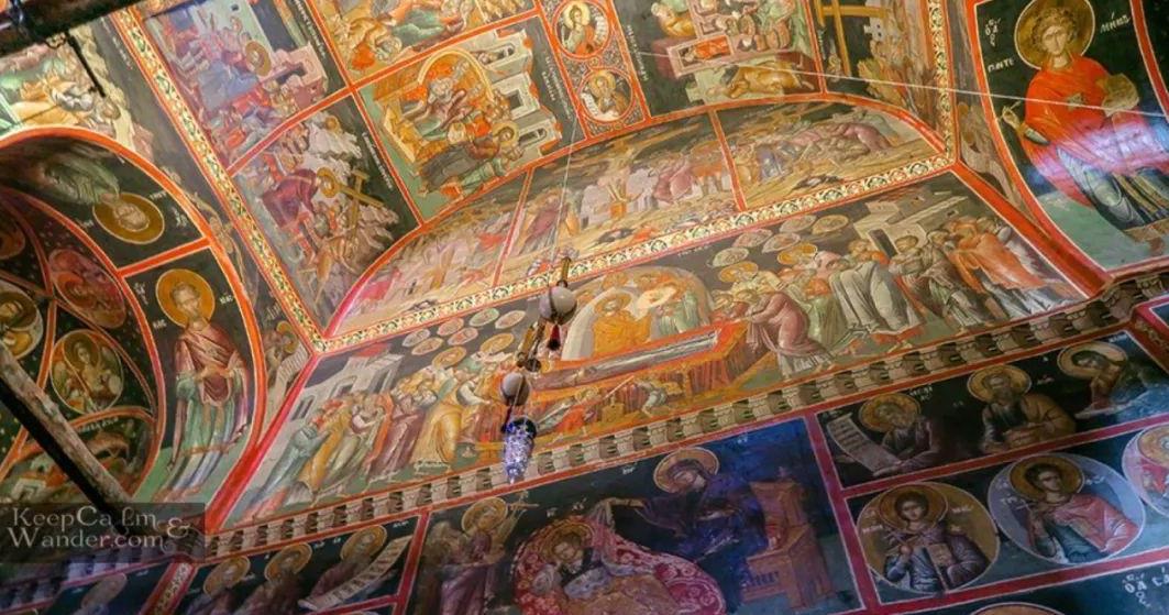 教堂的围墙是用岩石与砖块相间砌成。教堂内部除了15世纪的珍贵壁画外,还拥有各种雕嵌精美的用具,最具有代表性的是那张用珍珠镶嵌、装饰豪华精致的修道院院长宝座。