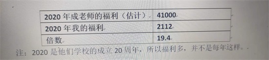 我2020年福利费2112元(包括教师节、元旦、过年),成老师的福利包括教师节、元旦、暑假旅游、中秋、过年等,估计8000元。如果遇到学校庆典的话,还有很高的奖金,如2020年9月的教师节,成老师获得了“十佳班主任奖”28000元,“连续三年荣获十佳班主任奖”追加5000元,共计41000元