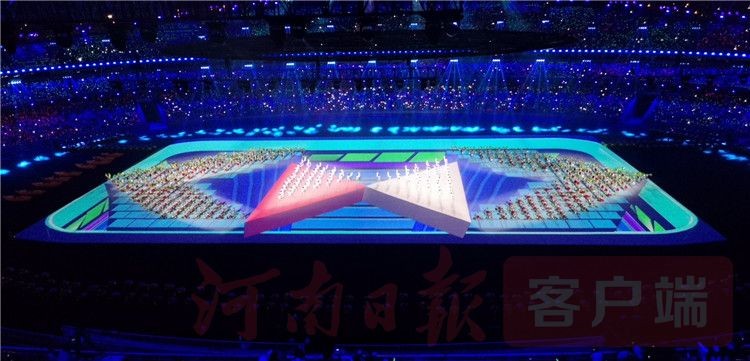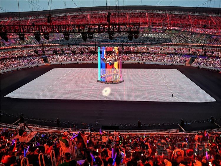参加开幕式的演出人员有4300余名。开幕式突破传统的观演模式,吊装直径80米、面积达5024平方米的巨型天幕,在空中呈现影像内容,与地面影像互动融合,延展表演空间,实现720°视觉效果和沉浸式演出,带给观众震撼的视觉体验。