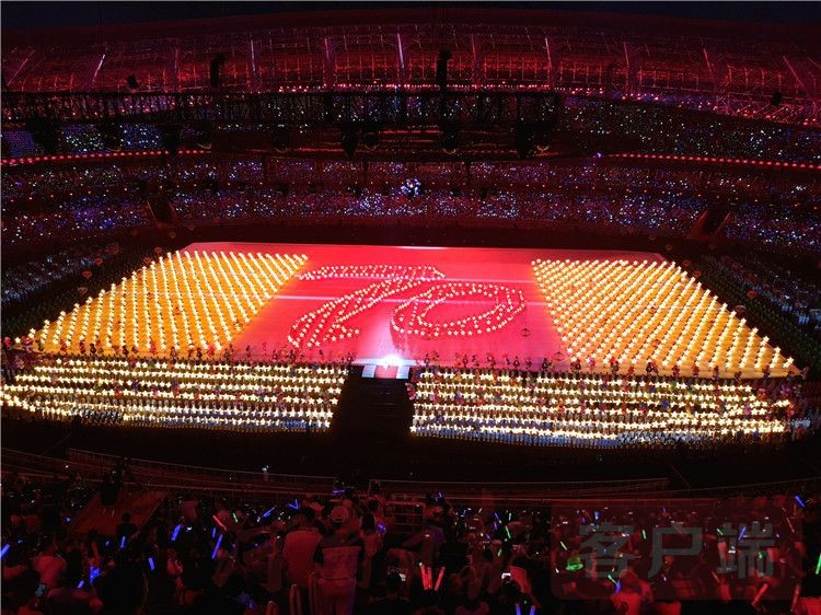 当长110米、宽70米、面积达7700平方米的巨幅五星红旗流动进入现场,万人同声齐唱《我爱你中国》,爱国激情瞬时燃爆全场,将整场演出推向高潮。