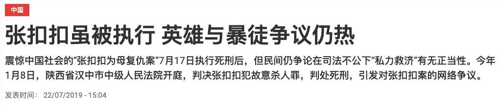 “张扣扣虽被执行 英雄与暴徒争议仍热” RFI 2019.07.22