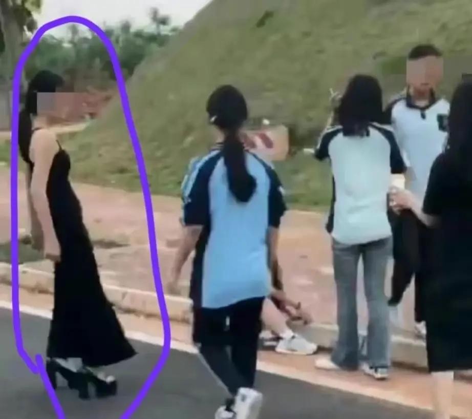 视频里,这些施暴者的得意欢呼与女生的哭泣声形成了鲜明对比。其中一名穿着黑色吊带裙和高跟鞋的女生尤其引人注意,她并非穿校服,引发了猜测她可能是校外人士。