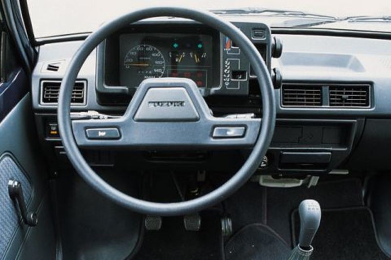 最初的长安奥拓,方向盘样式应该是那种直棱直角的样式,无奈没有找到初期型长安奥拓的内饰照片,用铃木原版车型的图片代替一下,方向盘样式相同。还有,奥拓的旋钮式空调操纵设计得很有意思,为内饰增加了些许精致感和趣味性