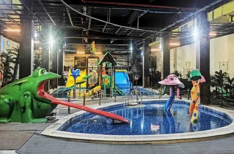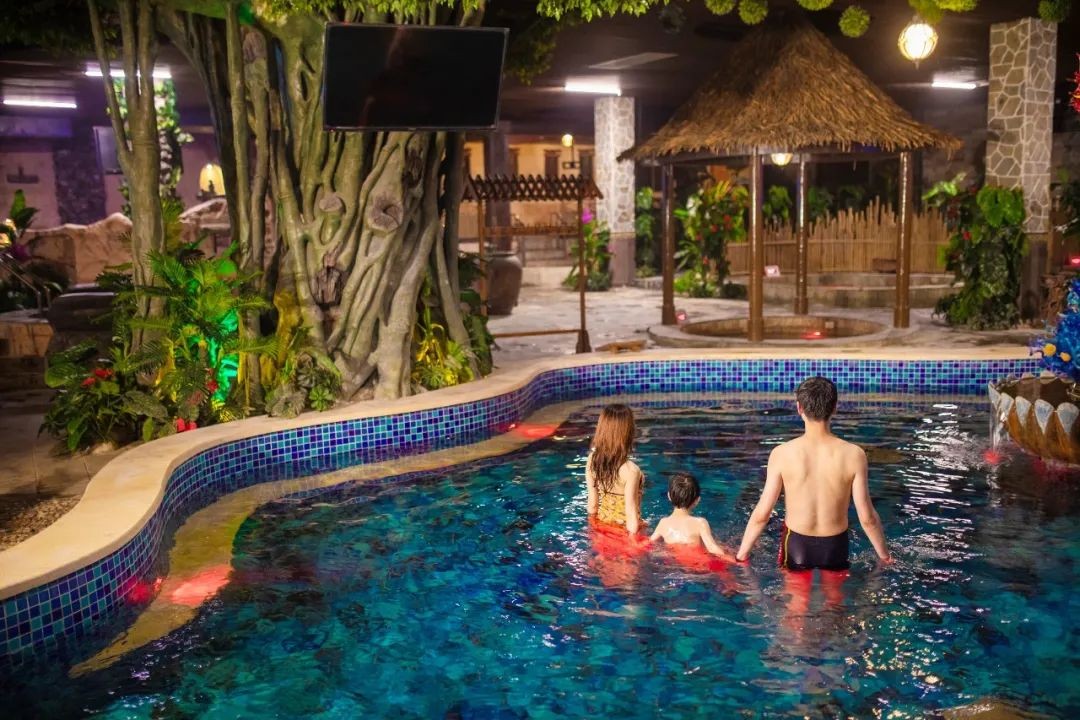 配有特色主题房间、儿童游乐园、儿童水上乐园等。温泉内有钟乳石溶洞区、竹林区、药王谷、玉石池、七彩池、盐浴、地热长廊、儿童区等38个形态不同,功能各异的温泉池,配设SPA间、汗蒸、香薰理疗、健身美体等服务。