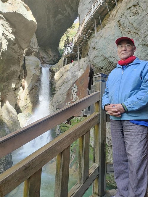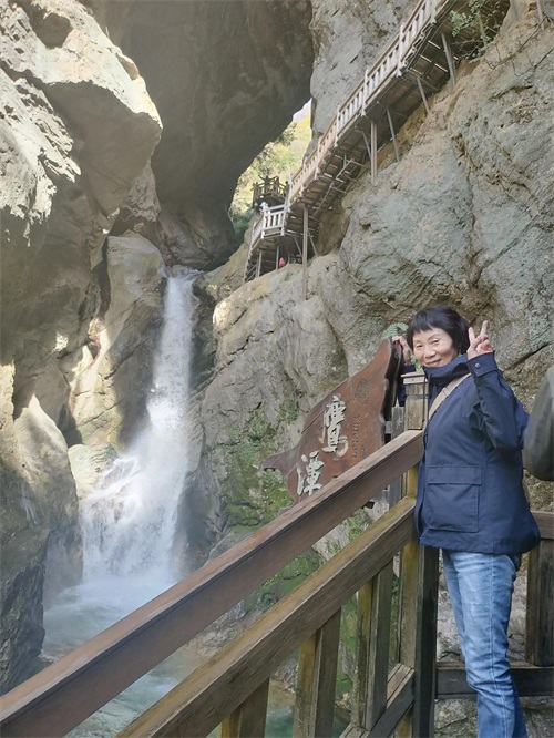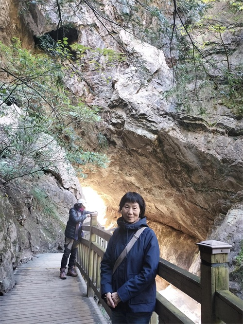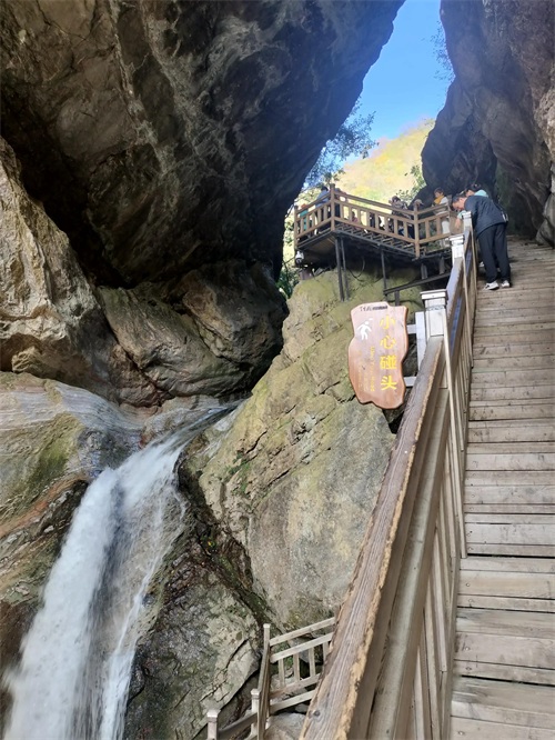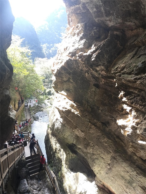沿着小河的左岸前行,一路上景区建了很多小桥、草屋、步道,以丰富景区的可游度。景区只是截取了黄岩河中间不长的一段河流,供游人游览观光。沿着景区长约300米、宽约80公分的石壁栈道蜿蜒而上。