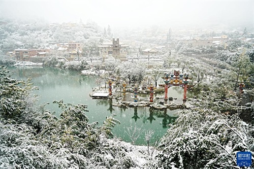 10月10日拍摄的甘肃省陇南市宕昌县官鹅沟景区鹿仁民俗村雪景。新华社发(刘辉 摄)