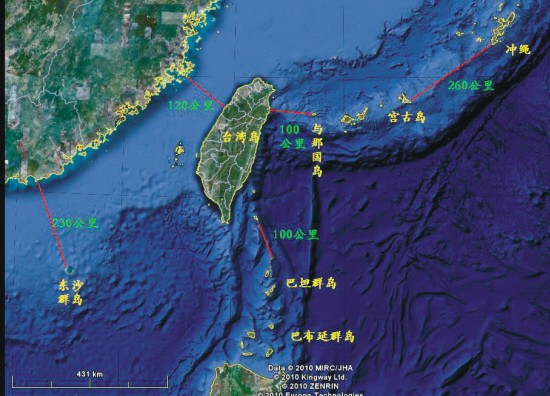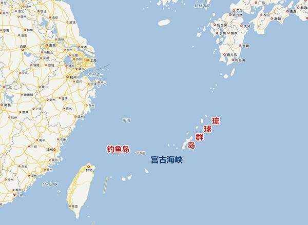 宫古海峡:又称宫古水道、宫古-冲绳水道、宫古-冲绳公海水道等,位于琉球群岛的宫古岛与久米岛—冲绳岛(南部有那霸基地)之间,是所谓第一岛链地带最宽的海峡(是台湾海峡的2倍)。最狭处在宫古岛与久米岛之间,为113海里即209公里;最宽处在宫古岛与冲绳岛南端之间,为145海里(约260公里);平均宽度129海里(即239公里),中部平均105海里(195公里)之宽是国际航道(上下各12海里是琉球的领海,其它为专属经济区,并非领海,他国有自由航行权)。中国的钓鱼岛、黄尾屿、赤尾屿等都在该海峡附近。