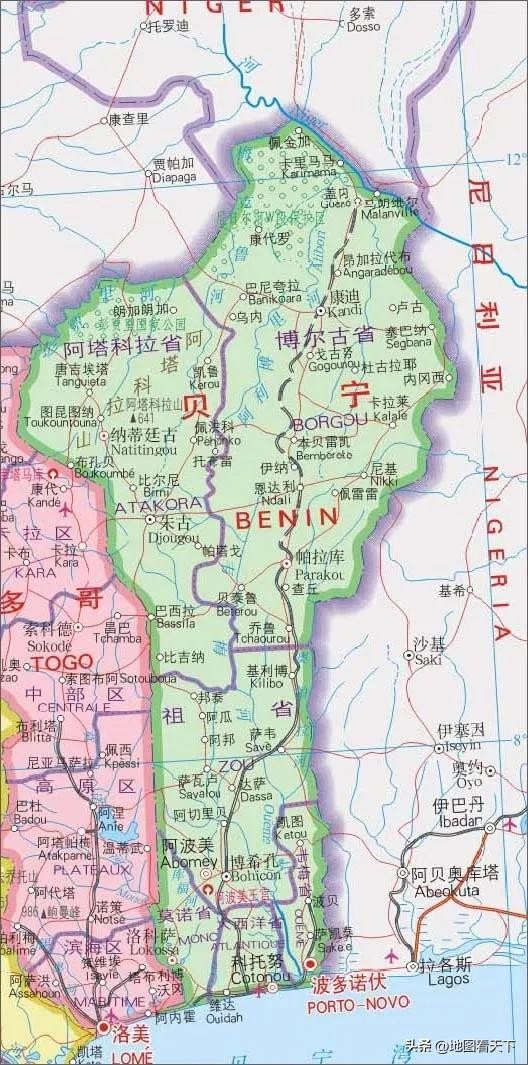 贝宁位于西非中南部的几内亚湾沿岸,东邻尼日利亚,东北与尼日尔交界,西北与布基纳法索相接,西与多哥接壤,南濒大西洋,海岸线长125公里。贝宁国土面积为11.26万平方公里,人口1250万。全境南北狭长,南窄北宽,北高南低,南部沿海平原宽约100多公里,地势低平,中部与北部为海拔200~400米的高原,约占全国面积的65%以上。高原西北有一系列并行山岭,东北西南走向。阿塔科拉山最高峰海拔641米。韦梅河是全国最大河流,北部属尼日尔河水系。